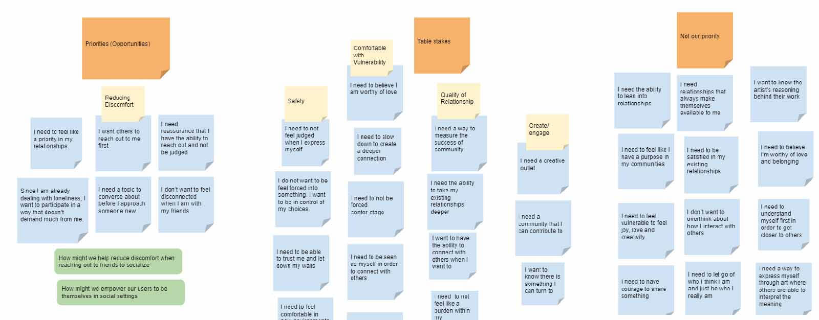 Based on our interviews and the archetypes we developed, we created a list of likes and dislikes for each of our three user types. Those, along their needs, were categorized between “Not our Priority”, “Table Stakes” and “Priorities” and proceeded to affinetize them according to similar patterns. From those affinitized categories, we created our design principles and, for each principle, two “how might we” statements to help push our concepts forward.