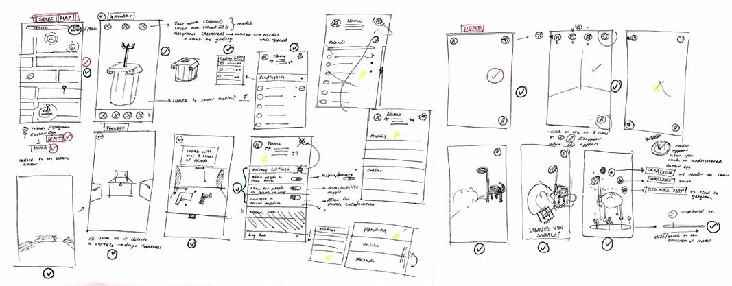 On the second half of the quarter, we conducted user testing every thursday and sunday to better inform our development decisions. Earlier concepts and wireframes were presented to people on the streets through cognitive walk-throughs. As prototypes started becoming more high-fidelity, testing happened under controlled environments and gave us ample feedback on more granular interactions, such as the best way to move objects around or wether the tools should be displayed in a 2D UI or in augmented reality form - with participants highly preferring the latter.
