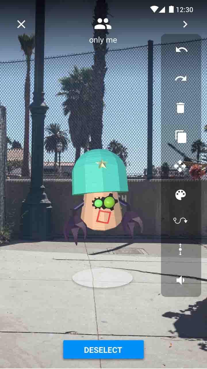 We constructed a series of principles regarding developing for AR based on our testing and research, since there aren't really any standards. The biggest challenge was figuring out what should be augmented UI elements in physical space and what should be part of the 2d interface. Google’s colors and material design, but with a lighthearted and playful twist, defined our UI style. When it came to branding the app, we wanted to choose a name that encompassed the freedom associated with creating in AR. Not only is this app an escape from the user’s reality, it is truly a limitless landscape for self-expression, thus Scapes was born.