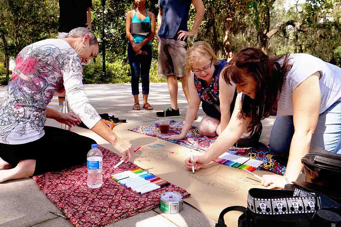 As an alternative research method, we brought a long sheet of brown paper and art supplies to a local park and asked people to draw the reason they were at Forsyth Park that day. Not only we learned compelling motives that make people get out of their houses, but also gained valuable insight on how people behave while collaborating in art and the importance of partaking in an activity with others, as they eased them into it.